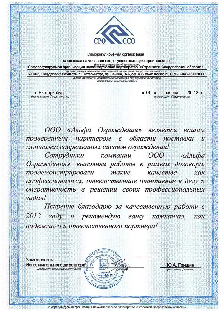 Сотрудники компании ООО «Альфа Ограждения», выполняя работы в рамках договора, продемонстрировали такие качества как профессионализм, ответственное отношение к делу и оперативность в решении своих профессиональных задач!