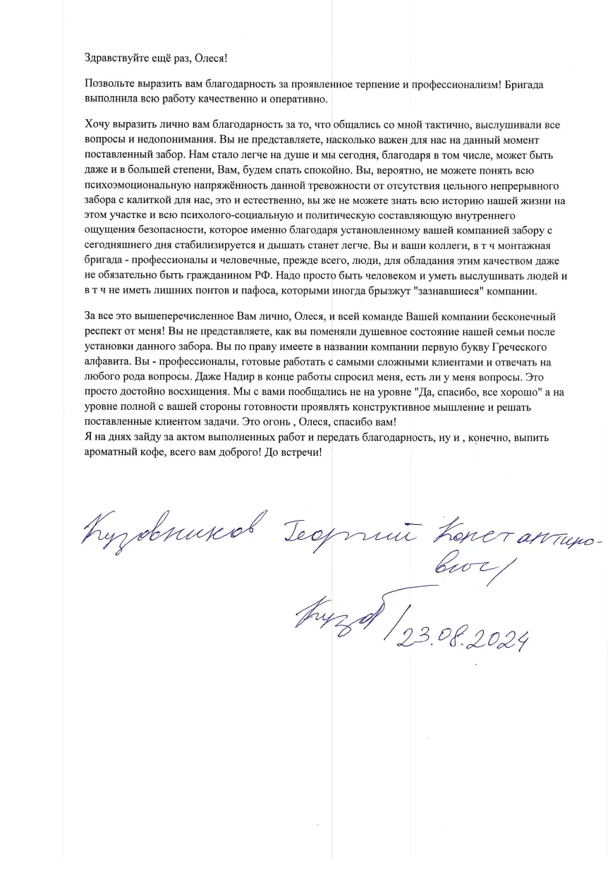 Мы благодарны ООО «Альфа Ограждения» за работу и готовы рекомендовать Вашу компанию как надежного и ответственного партнера.