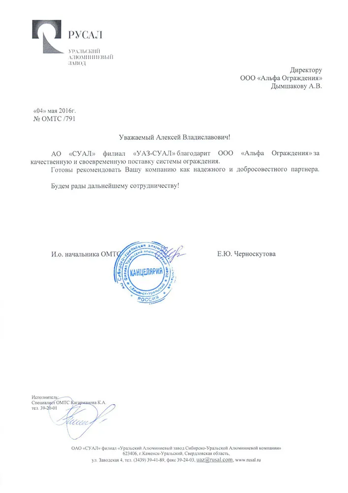 АО «СУАЛ» филиал «УАЗ-СУАЛ» благодарит ООО «Альфа Ограждения» за качественную и своевременную поставку системы ограждения.