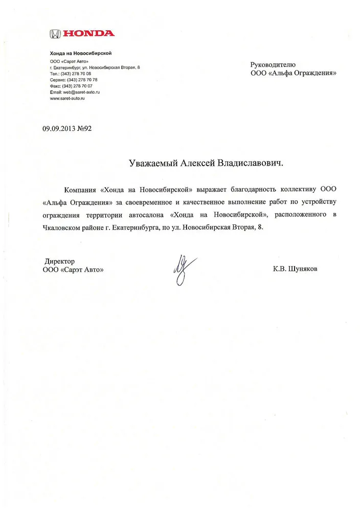 Компания «Хонда на Новосибирской» выражает благодарность коллективу ООО «Альфа Ограждения» за своевременное и качественное выполнение работ по устройству ограждения территории автосалона «Хонда на Новосибирской», расположенного в Чкаловском районе г.Екатеринбурга, по ул. Новосибирская Вторая, 8.