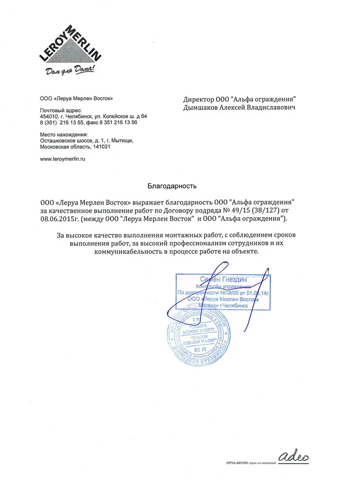 ООО «Леруа Мерлен Восток» выражает благодарность ООО «Альфа Ограждения» за качественное выполнение работ по Договору подряда №49/15 (38/127) от 08.06.2015г. (между ООО «Леруа Мерлен Восток» и ООО «Альфа Ограждения»).