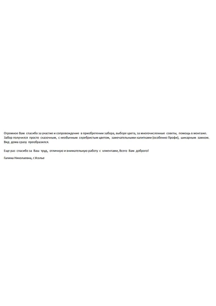 Огромное Вам спасибо за участие и сопровождение в приобретении забора, выборе цвета, за многочисленные советы, помощь в монтаже.