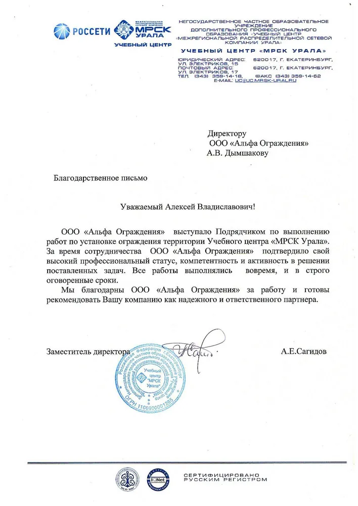 ООО «Альфа Ограждения» выступало Подрядчиком по выполнению работ по установке ограждения территории Учебного центра «МРСК Урала». За время сотрудничества ООО «Альфа Ограждения» подтвердило свой высокий профессиональный статус, компетентность и активность в решении поставленных задач. Все работы выполнялись вовремя, и в строго оговоренные сроки.