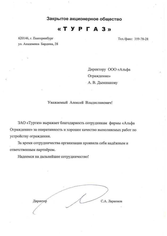 ЗАО «Тургаз» выражает благодарность сотрудникам фирмы ООО «Альфа Ограждения» за оперативность и хорошее качество выполняемых работ по устройству ограждения.
