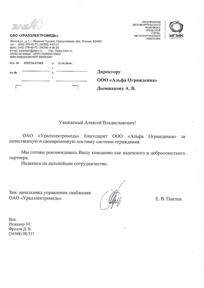 ОАО «УРАЛЭЛЕКТРОМЕДЬ» благодарит ООО «Альфа Ограждения» за качественную и своевременную поставку системы ограждения.